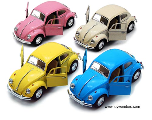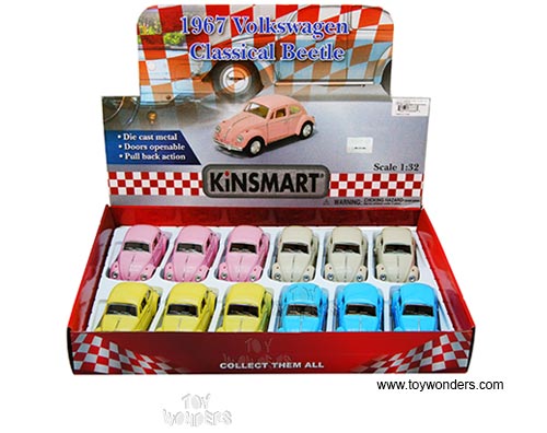 5375D Kinsmart - 1967 Volkswagen VW Classic Beetle Hard Top. 1:32 scale diecast collector model car. This 1967 Volkswagen beetle is a 5"L x 2"W x 1.75"H diecast metal classic with openable doors and pullback motor action. This 67 VW Bug is manufactured by Kinsmart. 88 pcs per inner box. 12 pcs per display box in assorted colors.