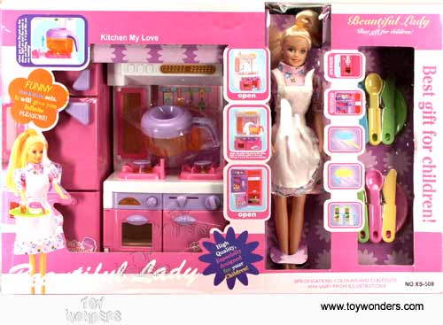 507/8 Kitchen Play Set with Doll. Kitchen measures 9.75"L x 9"H. Set include oven, stoves, cabinet, pot & more. When you place the pot on the stove, light on and the water in the pot boiling. It is just like you are cooking. Requires 4 "AA" batteries (not included). Box size: 18.5"L x 12.25"W x 4"H. Assorted styles. 6 pcs/inner.