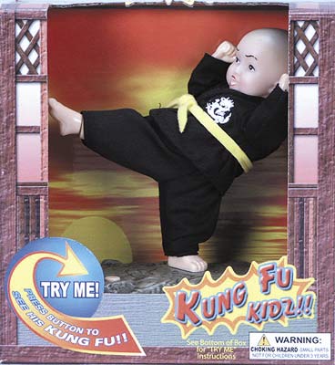 3702 Kung Fu Kidz (black uniform, shaved head). 5" Kung Fu kid standing on a rock practicing his kung fu kicks with music. Kung-Fu boy dressed in black uniform. "Try Me" packaging. Includes 3 "AA" batteries. Box size: 6.75"W x7"H x3.5"D.