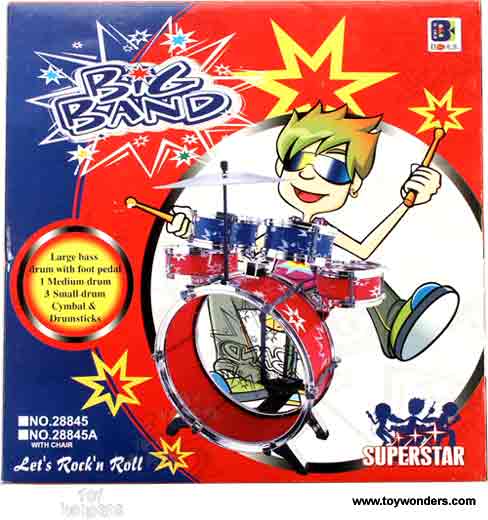28845 Let's Rock'n Roll Superstar Big Band. This musical instrument includes a large bass drum with foot pedal, 1 medium & 3 small drums, cymbal & drumsticks. Box size: 13.25"Lx 6"Wx 13.5"H.