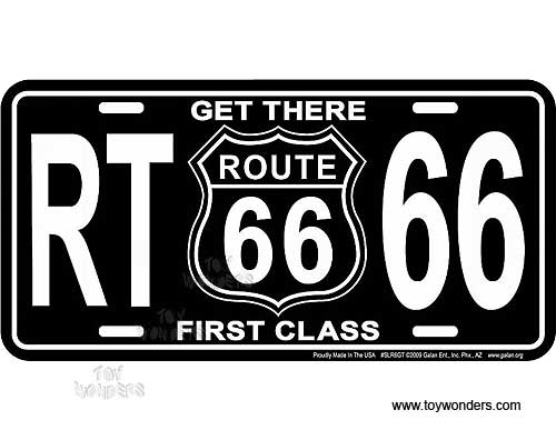 SLR6GT License Plate - Get There First Class Route 66 embossed aluminum metal sign. A collection of US Highway Route-66. Great for decorating vehicles, homes, offices, restaurants, etc. Sturdy aluminum. This license plate is approximately 6" x 12" with shrink wrap and pre-drilled holes.