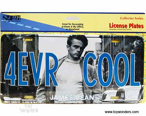 L12023 License Plate - James Dean 4evr Cool embossed aluminum metal sign. A collection of license plates. Great for decorating vehicles, homes, offices, restaurants, etc. Sturdy aluminum. This license plate is approximately 6" x 12" with shrink wrap and pre-drilled holes. Each license plate is individually blister carded. Card size: 12.1"L x 8"W.