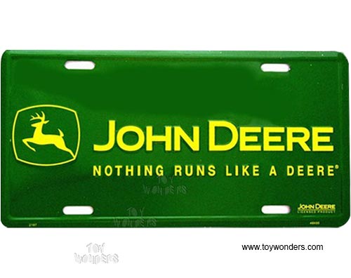 SLJD License Plate - John Deere Logo Farm Tractor green embossed aluminum metal sign. A collection of farm tractors. Great for decorating vehicles, homes, offices, restaurants, etc. Sturdy aluminum. This license plate is approximately 6" x 12" with shrink wrap and pre-drilled holes.