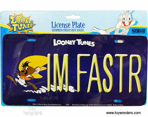 L12066 License Plate - Looney Tunes IM Faster embossed aluminum metal sign. A collection of license plates. Great for decorating vehicles, homes, offices, restaurants, etc. Sturdy aluminum. This license plate is approximately 6" x 12" with shrink wrap and pre-drilled holes. Each license plate is individually blister carded. Card size: 12.1"L x 8"W.