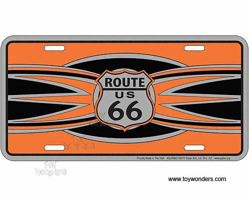 SLR6BO License Plate - Route 66 Black Orange embossed aluminum metal sign. A collection of US Highway Route-66. Great for decorating vehicles, homes, offices, restaurants, etc. Sturdy aluminum. This license plate is approximately 6" x 12" with shrink wrap and pre-drilled holes.