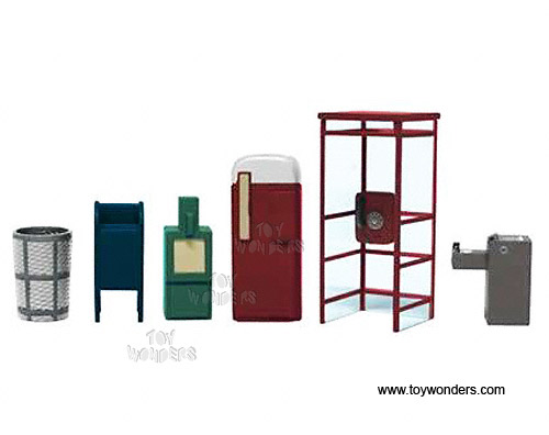 624197 Lionel Accesory - 6 pcs City Accessory Pack (O Scale or O Gauge). This City Accessory Pack includes telephone booth, trash can, mailbox, water drinking fountain, newspaper box & old fashion soda vending mechine. They are great for decorating model trains, cars and dioramas. Item 624197 is packed in a box. Box size: 6"L x 4"W x 1"H. This City Accessory Pack is manufactured by Lionel.