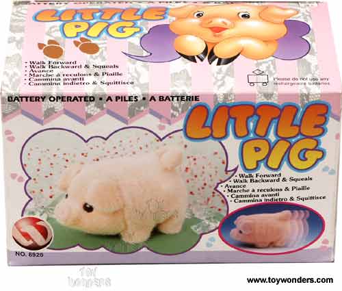 8926 Battery Operated Little Pig. This 7" pet walks forward, backward & squeals. Great for your pets. Requires 2 "AA" batteries (not included). Box size: 6.75"Lx 4"Wx 4.25"H. 12 pcs/inner.