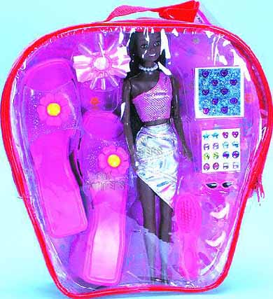 4786B Lorna Doll Beauty Set (Black). 11.5" lorna fashion doll with a pair of sandals for child and beauty accessories. 12 pcs/inner. Package size: 11.25"Lx2.5"Wx11.75"H.