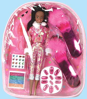 4776B Lorna Fashion Doll Set (Dark). 11.5" fashion doll. Includes a pair of sandels for girl, press-on nails and more. All comes in a see-thru backpack. Pkg. size: 10.75"Lx2.5"Wx12.25"H. 12 pcs/inner.
