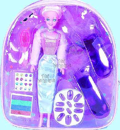4776 Lorna Fashion Doll Set (White). 11.5" fashion doll. Includes a pair of sandels for girl, press-on nails, and more. All comes in a see-thru backpack. Pkg. size: 10.75"Lx2.5"Wx12.25"H. 12 pcs/inner.