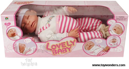 24025 Lovely Stuffed Baby Doll. 20" closed eyes baby doll. Press the abdomen, the baby willl cry, cough, turn head, fall asleep & snore. Looks like a real baby. Uses 3 "AA" batteries. Box size: 22.5"L x 9.5"W x 8.5"H. Assorted colors.