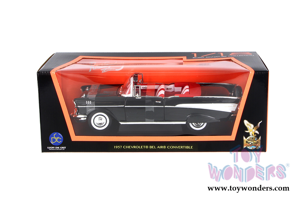 92108BK/12 Lucky Road Signature - 1957 Chevrolet Bel Air Convertible. 1:18 scale diecast collectible model. This 1957 Chevy Corvette measures 9.5"L x 3.5"W x 2.75"H. This 57 Vette is diecast convertible with openable doors, trunk, and hood.  Freewheels, and workable steering. Detailed engine and components. In terms of classic American cars, the 1957 Chevy Corvette is probably top 10. This 57 Chevy Corvette is manufactured by y Lucky Die-Cast Products Factory LTD. Individually packed in a window box. Box is 14.75"L x 5.75"W x 6.75"H. Item 92018BK/12 is in BLACK.