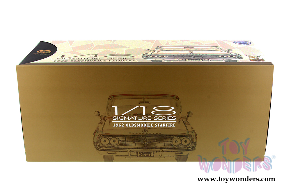 20208BG Lucky Road Signature - 1962 Oldsmobile Starfire Hard Top. 1:18 scale diecast collectible model car. This 1962 Oldsmobile Starfire is a 11.75"Lx 4"Wx 3"H die cast metal car with openable hood, doors & trunk, free wheels, workable steering. This Oldsmobile Starfire is manufactured by Lucky Die Cast Products Factory LTD. Item 20208R in GARNET (dark red) color. Individually packed in a decorated box. Box is 14.75"Lx 6.75"Wx 6.25"H. GM is a trademark of the General Motors Corporation.