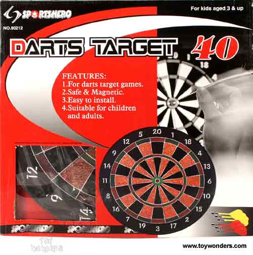 80212 Magnetic Darts Target Board. 15.75" diameter safe & magnetic dart game comes with six 3.25" magnetic head darts. Dart board is sectioned from 1 to 20 points. Great tool for teaching young children how to throw. Box size: 16"Lx 16"Wx 1"H.