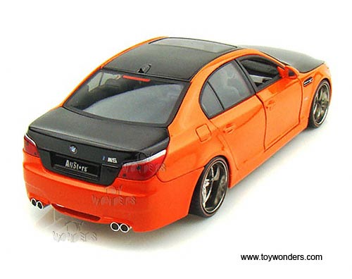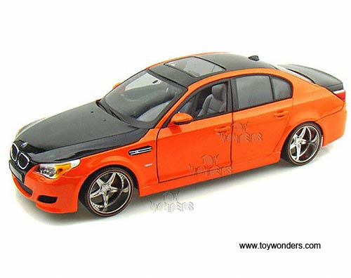 31335OR Maisto All Stars - BMW M5 Hard Top w/ Sunroof. 1:18 scale diecast collectible model car. This BMW M-5 is a 9.5"Lx 3.5"Wx 2.75"H die cast metal car with openable doors, hood & trunk. Sits on a display plaque. This BMW is manufactured by Maisto. 31335 is in ORANGE color with Black top. Individually packed in a window box. Box size: 13.5"Lx 7.5"Wx 5.5"H.