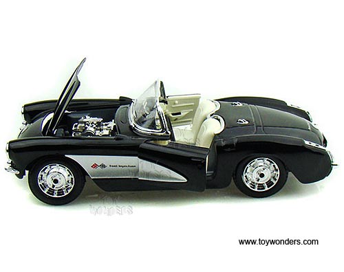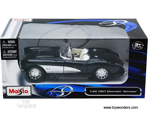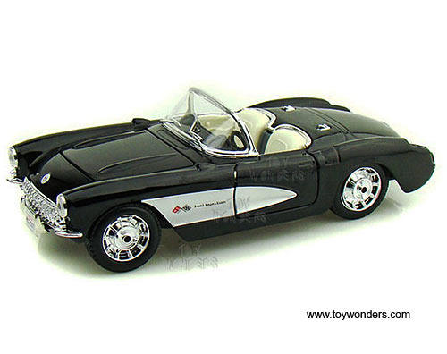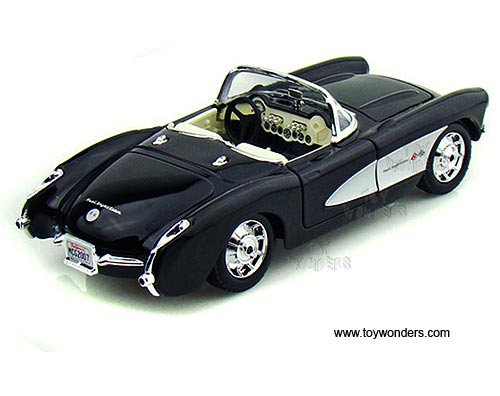 31275BK Maisto - 1957 Chevrolet Corvette Convertible. 1:24 scale diecast collectible model car. This Chevy Corvette is a 6.75"Lx 2.75"Wx 2"H diecast metal car with freewheeling, openable doors and hood. Each individually packed in a window box. Window Box size is 9"Lx 4.5"Wx 4"H. 31275BK is in BLACK color. This 1957 Chevrolet Corvette is manufactured by Maisto. GM is a trademark of the General Motors Corporation.