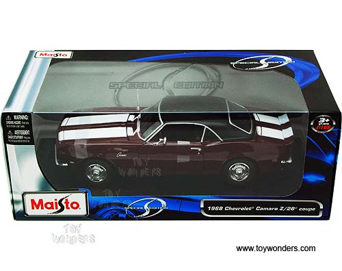 31685 MAISTO - 1968 Chevy Camaro Z28 Coupe Hard Top. 1:18 scale diecast collectible model car. This Chevrolet Camaro is a 10.25"L x 3.75"W x 2.75"H with open able doors, hood & trunk, detailed interior. Sits on a display plaque. Special Edition. This 68 Chevy Camaro Z/28 is manufactured by Maisto. 31685 is in MAROON color (like Burgundy) with white stripes and black roof. Individually packed in a window box. Box measures 13.25"L x 6.5"W x 5"H. GM is a trademark of the General Motors Corporation.