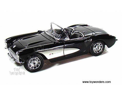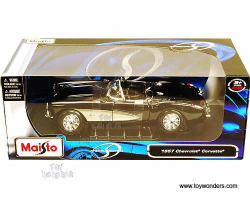 31139 Maisto - 1957 Chevrolet Corvette Convertible. 1:18 scale diecast collectible model car. This Chevy Corvette is a 9.25"L x 3.5"Wx 2.75"H die cast metal with opening hood, doors & trunk. Sits on a plaque. This Chevy Corvette Convertible is manufactured by Maisto. Item 31139 is in BLACK color. Individually packed in a window box. Box size: 13"Lx 6.5"Wx 5"H. GM is a trademark of the General Motors Corporation.