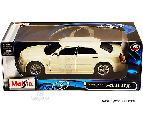 31120 Maisto Special Edition - 2005 Chrysler 300C Hemi Hard Top. 1:18 scale diecast collectible model car. This Chrysler 300C is a 10.5"L x 3.5"W x 3"H diecast metal car with openable hood, doors & trunk. Maisto Special Edition. Sits on a display plaque. This 2005 Chrysler 300-C is manufactured by Maisto. 31120 is in BEIGE color (like white). Individually packed in a window box. Box size: 13"L x 6.5"W x 5"H.