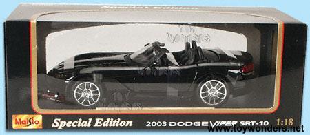 31632B MAISTO 2003 Dodge Viper SRT-10 Scale: 1:18 Dimensions: 9.5"L x 4"W x 2.5"H '03 Viper SRT 10 features opening doors, hood, and trunk, detailed engine & components, and working steering. Display platform included. Manufactured by Maisto Individually packaged in window box Color: Black