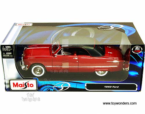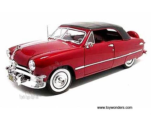 31681R Maisto - 1950 Ford Convertible Soft Top. 1:18 scale diecast collectible model car. This Ford is an 11"L diecast collection car with openable doors, hood & trunk. Detailed components. Workable steering. Display stand. 31681R in RED color. Individually packed in a window box.