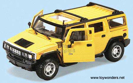 34231/3 MAISTO Hummer H2 SUV Scale: 1:27 Dimensions: 7"L x 3"W x 2.75"H Hummer die cast SUV features opening doors, free wheeling action, and sunroof. Manufactured by Maisto 4 pcs per display box in assorted colors: black, pewter, white, and yellow Case pack: 24 pcs. Sold in lots of 4 pcs.