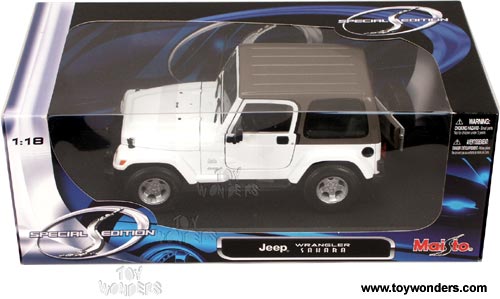 31662W Maisto - Jeep Wrangler Sahara. 1:18 scale diecast collectible model car. This Jeep is an 8.5"L x 3.5"W x 3.75"H diecast SUV with workable steering, openable doors, hood, and rear door.  Sits on a display platform. Jeep is a registered trademark under the Chrysler Corporation. The Jeep is manufactured by Maisto. 31662W in WHITE color. Individually packed in a window box. Box size: 13"L x 6.5"W x 5"H.