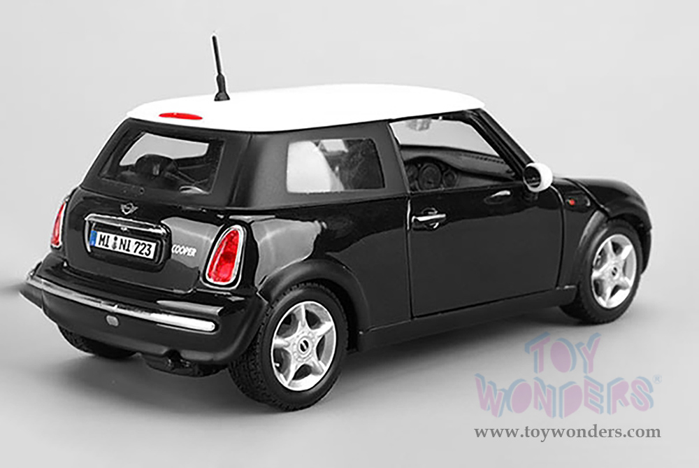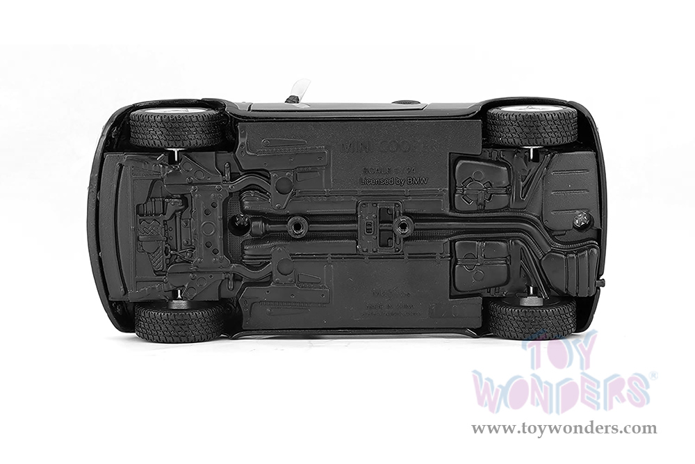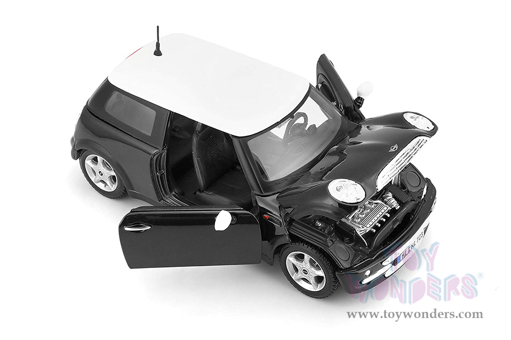 31219BK Maisto - Mini Cooper Hardtop. 1:24 scale die-cast collectible model car. This Mini Cooper is a 5.5"L x 2.25"W x 2.25"H diecast metal car with freewheeling, openable hood, and doors. Each individually packed in a window box. Window Box size is 9"L x 4.5"W x 4"H. 31219BK is in Matte Black. This Mini Cooper is manufactured by Maisto.