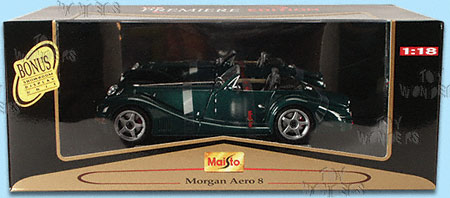 36637GN MAISTO Morgan Aero 8. 1:18 scale diecast model car. This Morgan Aero 8 is a 9"L x 3.75"W x 2.25"H diecast metal oldies with detailed engine and interior, workable steering, free wheels and opening doors/hood/trunk. Sits on a stackable display plaque. Individually packed in a window box. Box measures 13.5"W x 5.25"H x 7.25"D. Manufactured by Maisto. Premiere Edition. 36637 in GREEN color.
