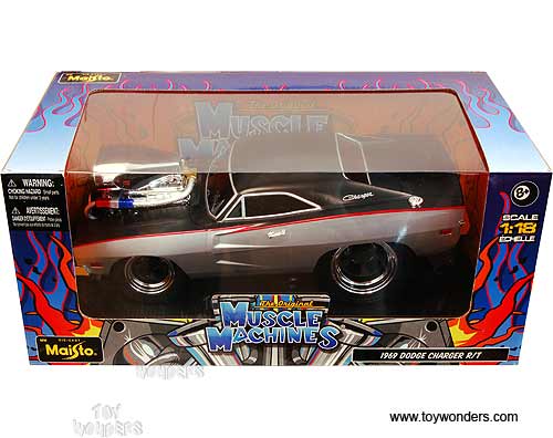 32209 Maisto Muscle Machines - 1969 Dodge Charger R/T Hard Top w/ Engine Blower. 1:18 scale diecast collectible model car. This Dodge Charger R/T is a 10"L x 4.5"W x 3"H die cast metal car. 32209 is in SILVER & BLACK 2-tone colors. This 69 Dodge Charger R/T is manufactured by Maisto. Individually packed in a window box. Box size: 12.5"Lx 6.5"Wx 5.5"H.