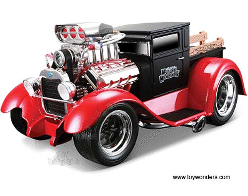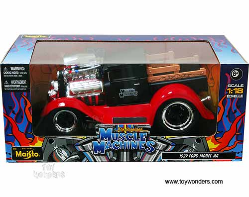 32201 Maisto Muscle Machines - 1929 Ford Model AA Pickup w/ Engine Blower. 1:18 scale diecast collectible model car. This Ford Model AA Pic-up is a 9.25"L x 5"W x 4"H die cast metal car. Sits on a display plaque. 32201 is in BLACK & RED 2-tone colors. This 29 Ford Model AA Pick up is manufactured by Maisto. Individually packed in a window box. Box size: 12.5"Lx 6.5"Wx 5.5"H.