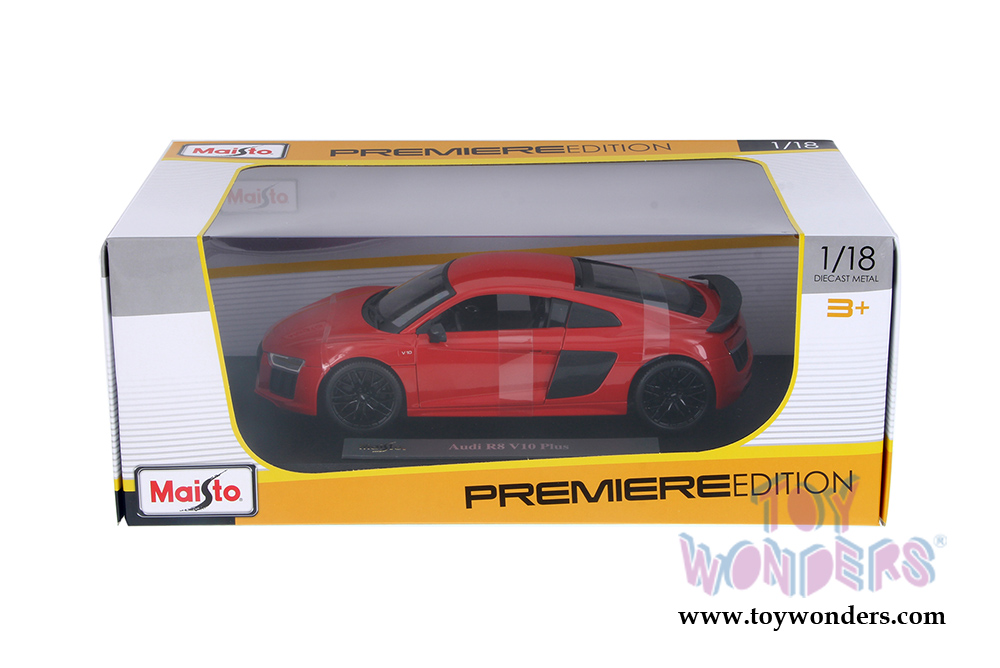 36213OR Maisto Premiere Edition - Audi R8 V10 Plus Hardtop. 1:18 scale diecast collectible model car. This Audi R-8 is a 9.25"L x 4"W x 2.5"H diecast metal with openable doors, hood, and trunk. Sits on a display plaque. This Audi R8 is manufactured by Maisto. Premiere Edition. Individually packed in a window box. Box size: 13.75"L x 7.5"W x 5.5"H. 36213OR is in ORANGE color.