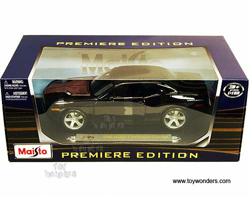 36138 Maisto Premiere - 2006 Dodge Challenger Concept Hard Top. 1:18 scale diecast collectible model car. This 2006 Dodge Challenger is a 10.5" long x 4.5"Wx 2.75"H die cast with opening doors, hood & trunk, detailed components, and workable steering. Display platform. Premiere edition. This 06 Dodge Challenger is manufactured by Maisto; ref. no. 36138 in BLACK color. Individually packed in a window box. Box size: 14.75"Lx 7.25"Wx 5.5"H.