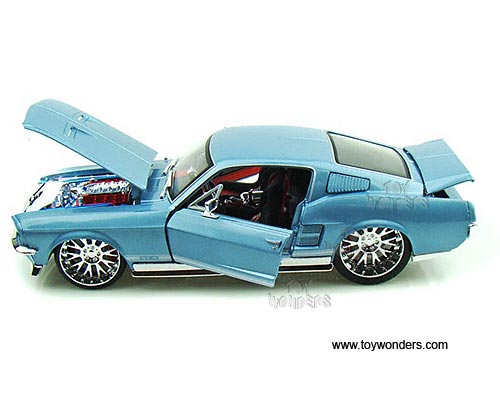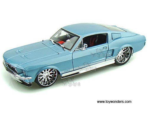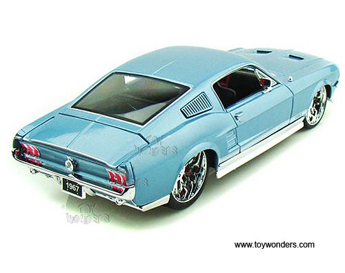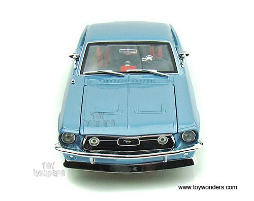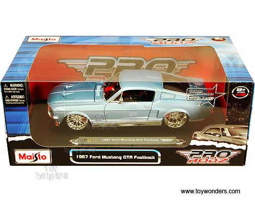 31351 Maisto Pro Rodz - 1967 Ford Mustang GTA Fastback Hard Top. 1:18 scale diecast collectible model car. This Ford Mustang GTA is a 10"L x 3.25"W x 2.5"H die cast classic car with openable doors, hood & trunk. Detailed engine & components. Sits on a display plaque. 31351 in BLUE color. This 1967 Ford Mustang GTA Fastback is manufactured by Maisto. ProRodz. Individually packed in a window box. Box size: 13.75"L x 7.5"W x 5.5"H.