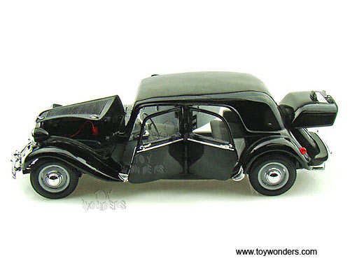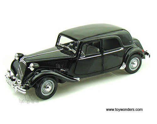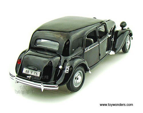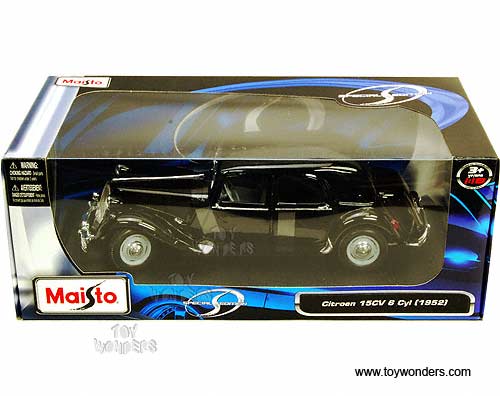 31821 Maisto Special Edition - 1952 Citroen 15CV 6 Cyl Hardtop. 1:18 scale diecast collectible model car. This 1952 Citroen 15CV 6 Cyl is a 10.5"L x 3.75"W x 3"H diecast metal car with openable hood, doors, and trunk. Special Edition. Sits on a display plaque. This 1952 Citroen 15CV 6 Cyl is manufactured by Maisto. Item 31821 is in BLACK color. Individually packed in a window box. Box size: 13.25"L x 6.5"W x 5"H.