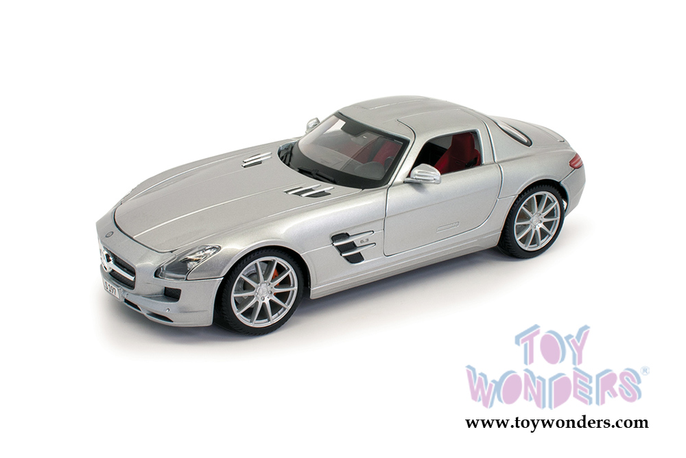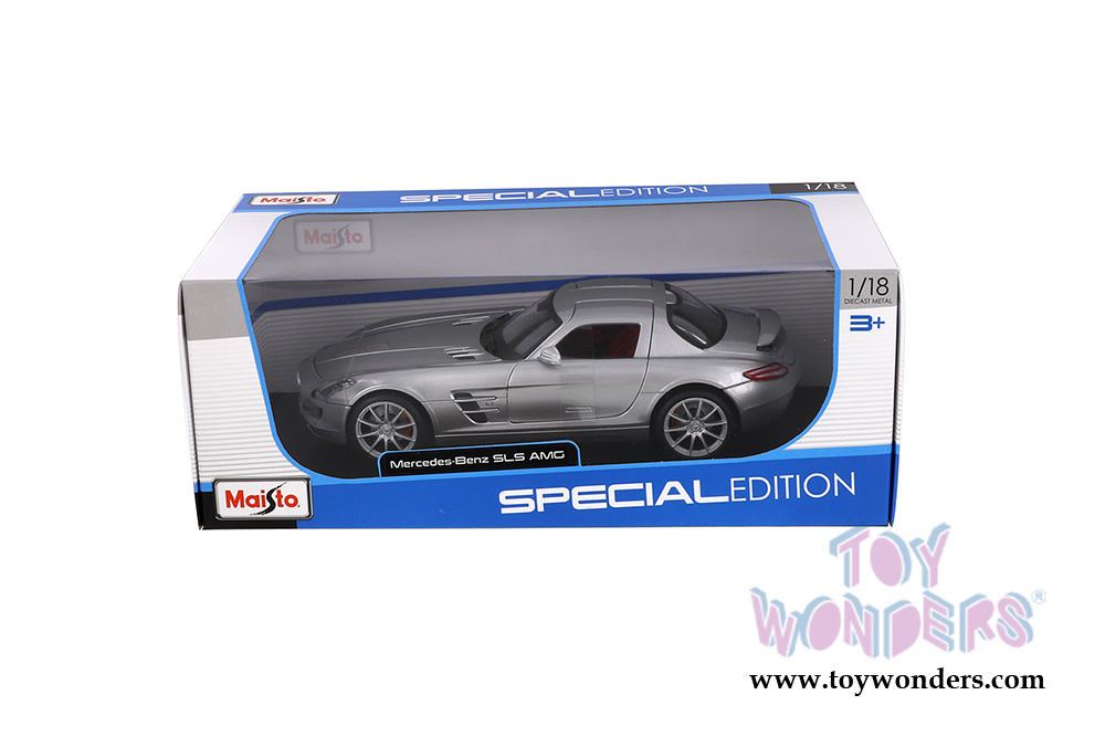 31389SV Maisto - Special Edition | Mercedes-Benz SLS AMG Hardtop. 1:18 scale diecast collectible model car. This Mercedes-Benz is a 10"L x 4.5"W x 2.75"H diecast metal car with openable hood and gull wing doors. Freewheeling. Detailed interior, exterior, engine compartment. This Mercedes is manufactured by Maisto. Each individually packed in a window box. Box size is 13"L x 6.5"W x 5"H. Item 31389SV is in SILVER.