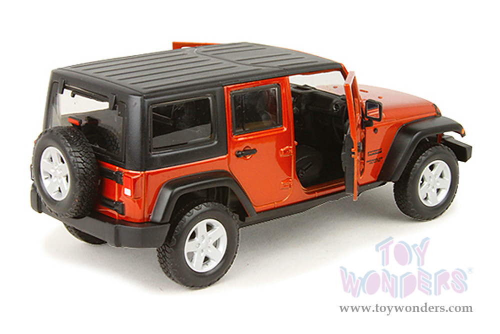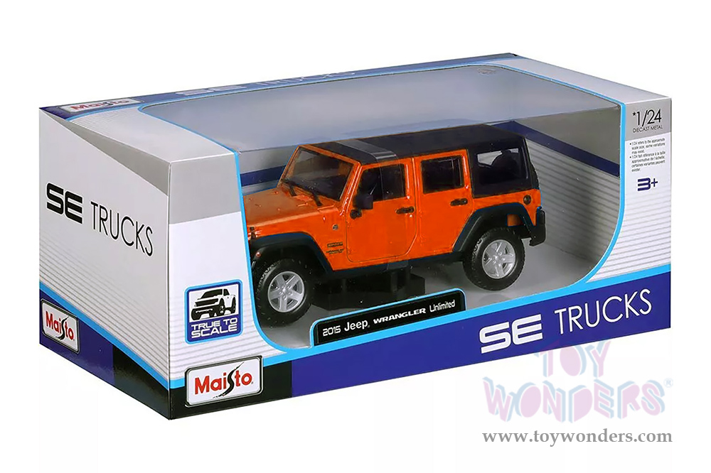 38268OR Maisto - Special Edition Trucks | 2015 Jeep® Wrangler Unlimited. 1:24 scale diecast collectible model car. This Jeep® is a 7.5"L x 3"W x 3"H die cast metal car with openable doors. Freewheeling and rubber tires. Each individually packed in a window box. Box size is 11.25"L x 5.5"W x 4.75"H. 38268OR is in orange color. This 2015 Jeep® Wrangler is manufactured by Maisto.