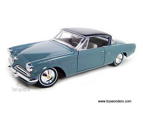 31651BU Maisto - 1953 Studebaker Starliner Hard Top. 1:18 scale diecast collectible model car. This Studebaker Starliner is a 10.75"Lx 3.5"Wx 2.75"H die cast metal with openable doors, hood & trunk. Sits on a display plaque. This 1953 Studebaker Starliner is manufactured by Maisto. 31651 in BLUE color with Black roof. Individually packed in a window box. Box size: 13"Lx 6.5"Wx 5"H.