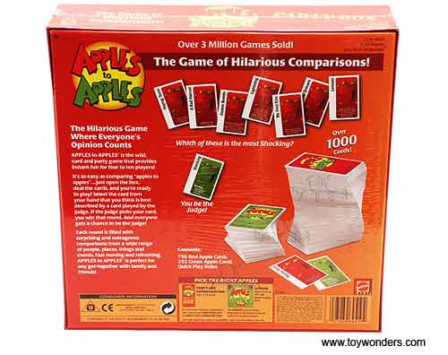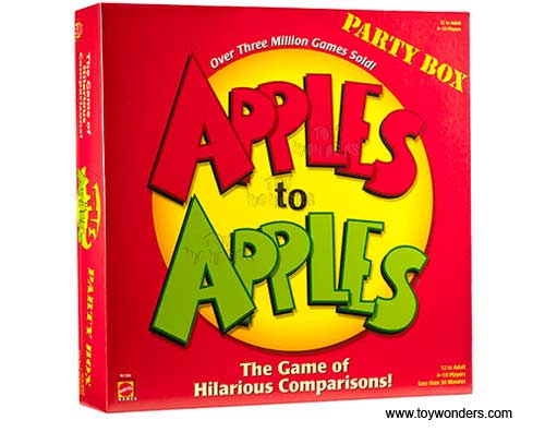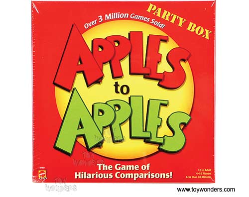 N1384/99Y3 Mattel - Apples to Apples Party Box The Game of Hilarious Comparisons. This game set includes: 756 red apple cards, 252 green apple cards and quick play rules. For ages 12 and up. 4 to 10 players. Box size: 10.5"L x 10.5"W x 2.5"H.