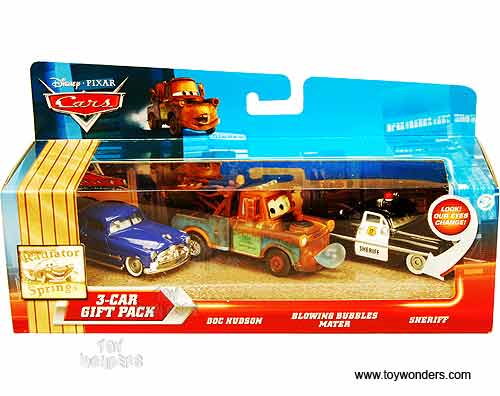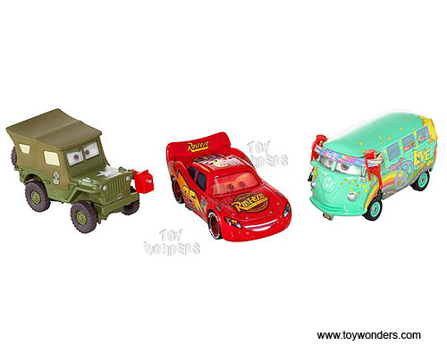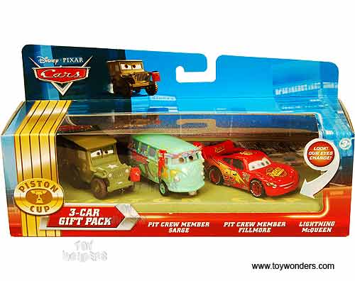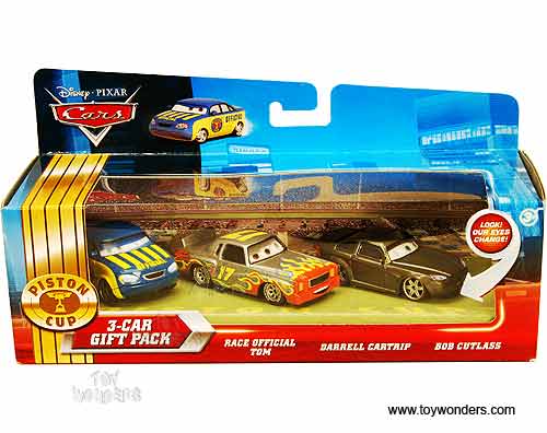 R2198/999D Mattel Disney Pixar - 3-Car Gift Pack Assortment. 3.25" long approximately 1:64 scale diecast collectible Disney cars. These Disney cars are manufactured by Mattel. Each set contains 3 assorted cars, and packed in a window box. Box size: 9.5"L x 3.25"W x 3"H. Assortment includes: