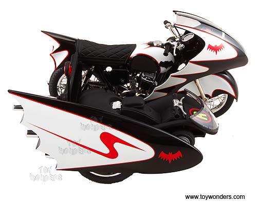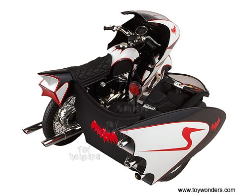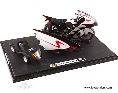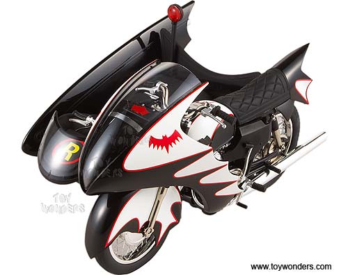 R0006/9964 MATTEL Elite Batman - 1966 TV Series Batcycle & Sidecar. 1:12 scale diecast collectible model car. This Batcycle is a 6.75"L x 4.75"W x 4"H die cast metal. Limited edition 1 of 9966 pcs. The Batcycle is manufactured by Mattel. Individually packed in a window box. Box size: 13.25"L x 8.5"W x 5.875"H. R0006/9964 is in BLACK color.