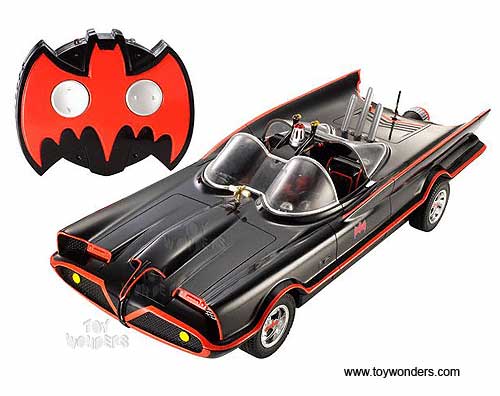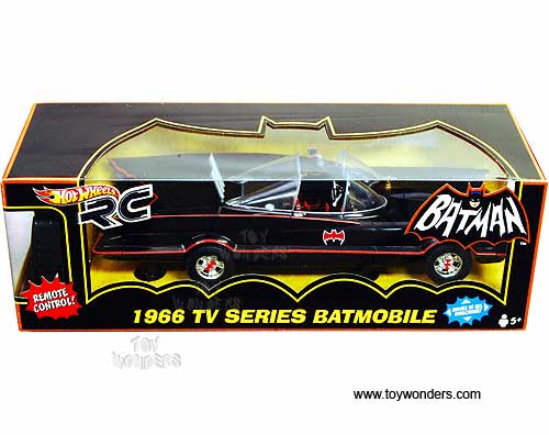 V0068/9993 Mattel Hot Wheels Batman - R/C Radio Control Full-Function 1966 TV Series Batman's Batmobile. This Batmobile is a 12.25" long radio controlled car. Includes 1966 Batman TV Series vehicle and Bat Emblem controller. It moves in all directions. Requires 6 "AA" batteries (not included). Box size: 15"L x 5.25"W x 5"H. This remote controlled Batmobile is manufactured by Mattel. V0068/9993 is in BLACK color. Note: This item contains no any diecast metal.
