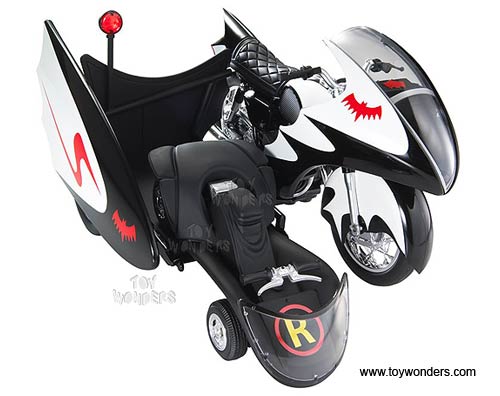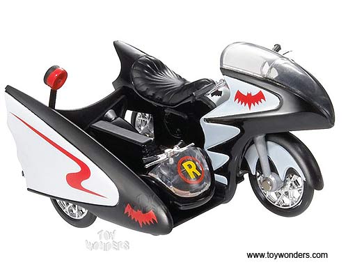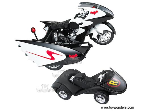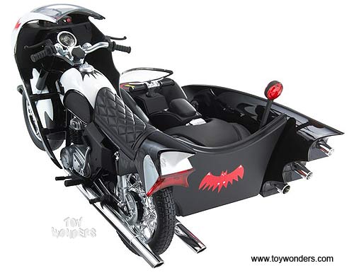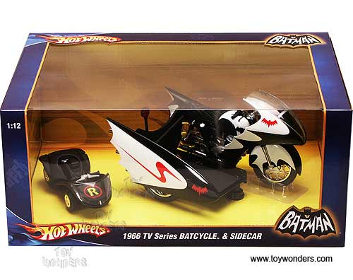 P6923/9993 MATTEL Hot Wheels Batman - 1966 TV Series Batcycle & Sidecar. 1:12 scale diecast collectible model car. This Batcycle is a 6.75"L x 4.75"W x 4"H die cast metal. The Batcycle is manufactured by Mattel. Individually packed in a window box. Box size: 13.25"L x 8.5"W x 5.875"H. P6923/9993 is in BLACK color.