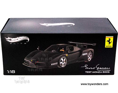 X5488/9964 Mattel Hot Wheels Elite - Enzo Ferrari Hard Top - Test Monza 2003. 1:18 scale diecast collectible model car. This Enzo Ferrari die cast metal car features openable hood, doors & trunk. This Enzo Ferrari is manufactured by Mattel. Individually packed in a box. Box size: 12.5"Lx 6.3"Wx 5"H. X5488/9964 is in MATT BLACK color.