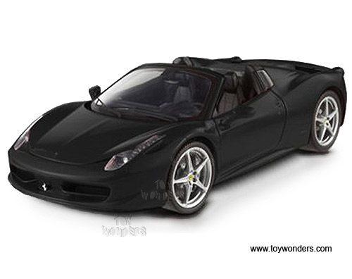 BCJ90 Mattel Hot Wheels Elite - Ferrari 458 Spider Convertible. 1:18 scale diecast collectible model car. This Ferrari 458 Spider is a die cast metal car with openable hood, doors & trunk. Sits on a display plaque. This Ferrari 458 Spider is manufactured by Mattel. BCJ90 is in BLACK color. Individually packed in a window box.