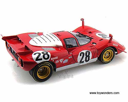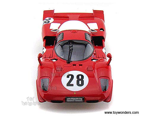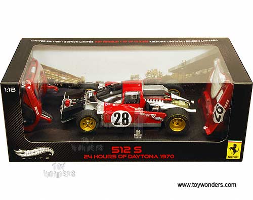 N2047/9964 Mattel Hot Wheels Elite - Ferrari 512 S #28 (24 Hours of Daytona 1970). 1:18 scale diecast collectible model car. This Ferrari 512 S race car is an 8.75"Lx 4"Wx 2.25"H die cast metal car with openable doors, and removable hood & trunk covers. Sits on a display plaque. This Ferrari 512S racing car is manufactured by Mattel. N2047/9964 is in RED color. Individually packed in a window box. Box size: 13.25"Lx 6.75"Wx 5"H. Limited edition 1 of 5000 pcs.