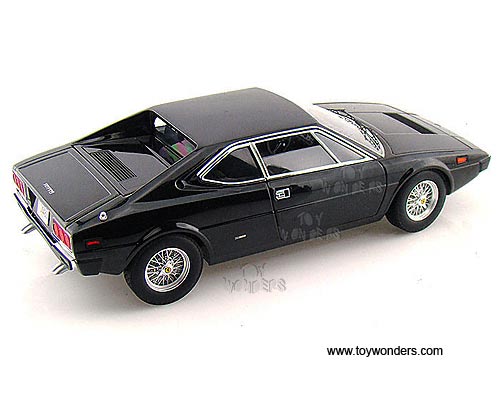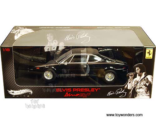 V7425/9964 Mattel Hot Wheels Elite - Ferrari Dino 308GT4 Hard Top owned by Elvis Presley. 1:18 scale diecast collectible model car. This Ferrari Dino 308GT4 is a 9.25"Lx 3.5"Wx 2.5"H die cast metal car with openable hood, doors & trunk. Sits on a display plaque. Limited edition 1 of 5000 pcs. This Ferrari Dino 308 GT-4 is manufactured by Mattel. V7425/9964 is in BLACK color. Individually packed in a window box. Box size: 13.25"Lx 6.75"Wx 5"H. Limited edition 1 of 5000 pcs.