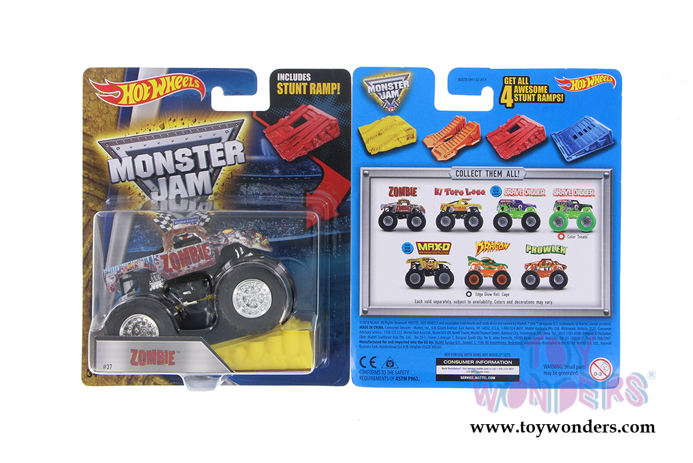 21572/984M Mattel Hot Wheels - Monster Jam Assortment. 1:64 scale diecast model. These trucks are 3.5"L x 2.25"W x 2.5"H die cast body and chassis mega monster tires & 4-wheel turning action. They include a Stunt Ramp. Manufactured by Mattel. Each car individually blister carded. Card size: 5.5" x 6.5". Item 21572/984M is in assorted colors and styles.