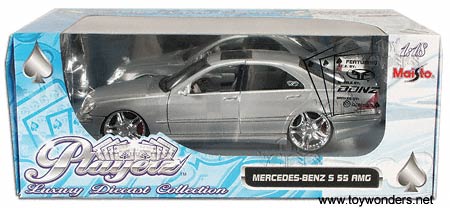 31051SV MAISTO Mercedes Benz S55 AMG (Playerz). 1:18 scale diecast model. This Benz is a 10.25" long diecast with opening doors/hood/trunk. This Mercedes-Benz is manufactured by Maisto; ref. no. 31051 Mercedes Benz S-55 AMG in SILVER color.