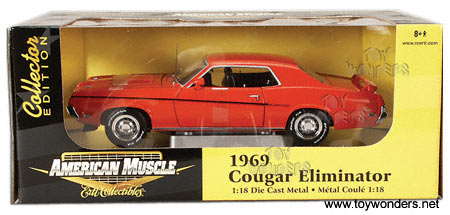 33688OR ERTL American Muscle Mercury Cougar Eliminator (1969). 1:18 scale diecast model. This 1969 Mercury Cougar Eliminator is a 10.5" long diecast with opening doors/hood/trunk. This 69 Mercury is manufactured by American Muscle. ORANGE only.